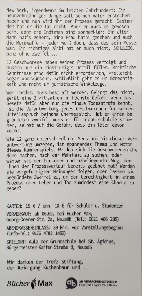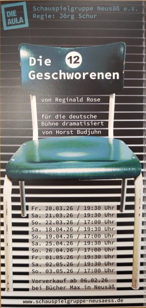 Unter der Regie von Jörg Schur spielen wir in dieser Saison ein spannendes Gerichtsdrama und Kammerspiel, welches am 20.03.2026 Premiere hat. Lassen Sie sich fesseln von einem Stück, in dem Themen wie Vorurteile, Gerechtigkeit und die Verantwortung des Einzelnen zum Nachdenken und Diskutieren anregen.